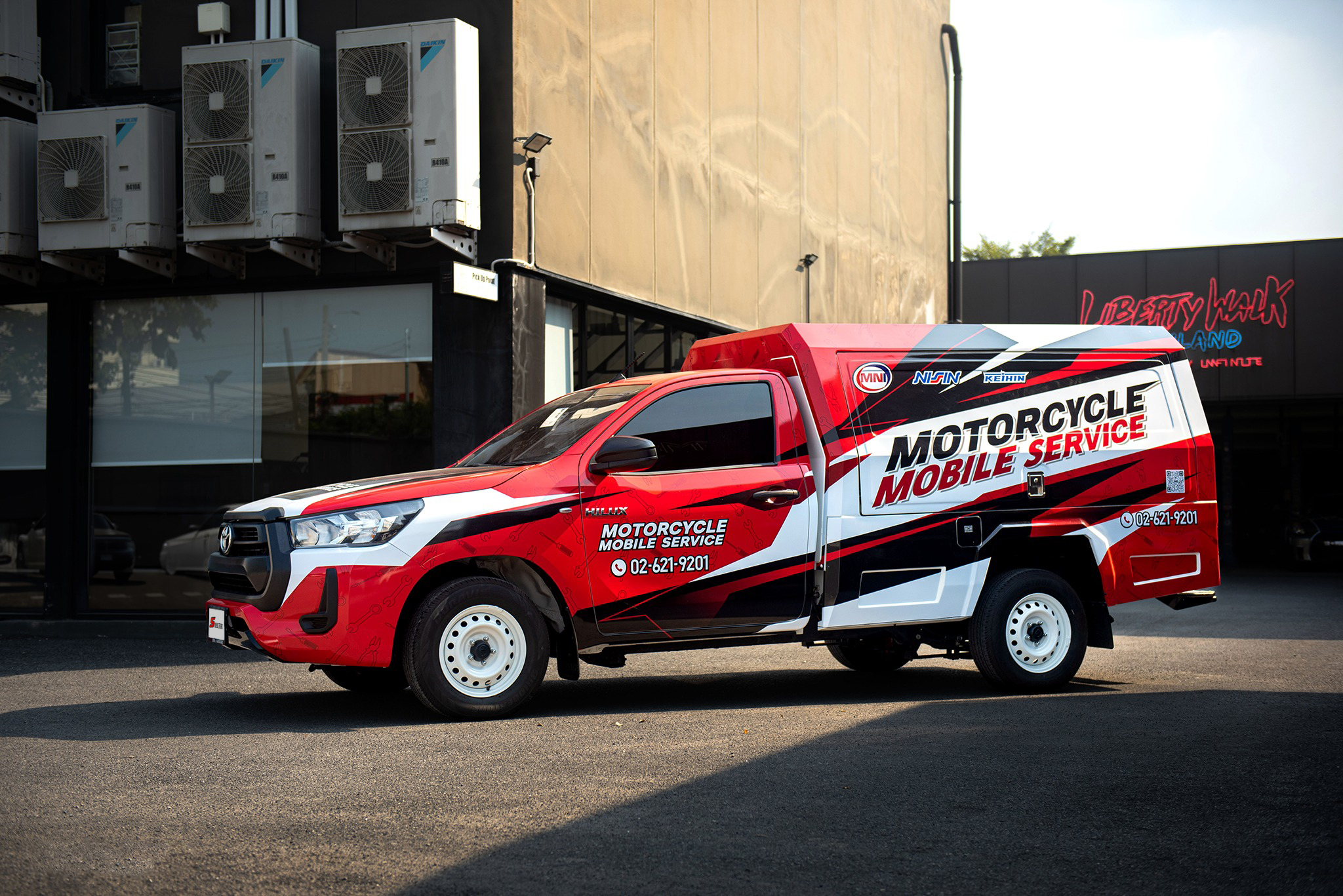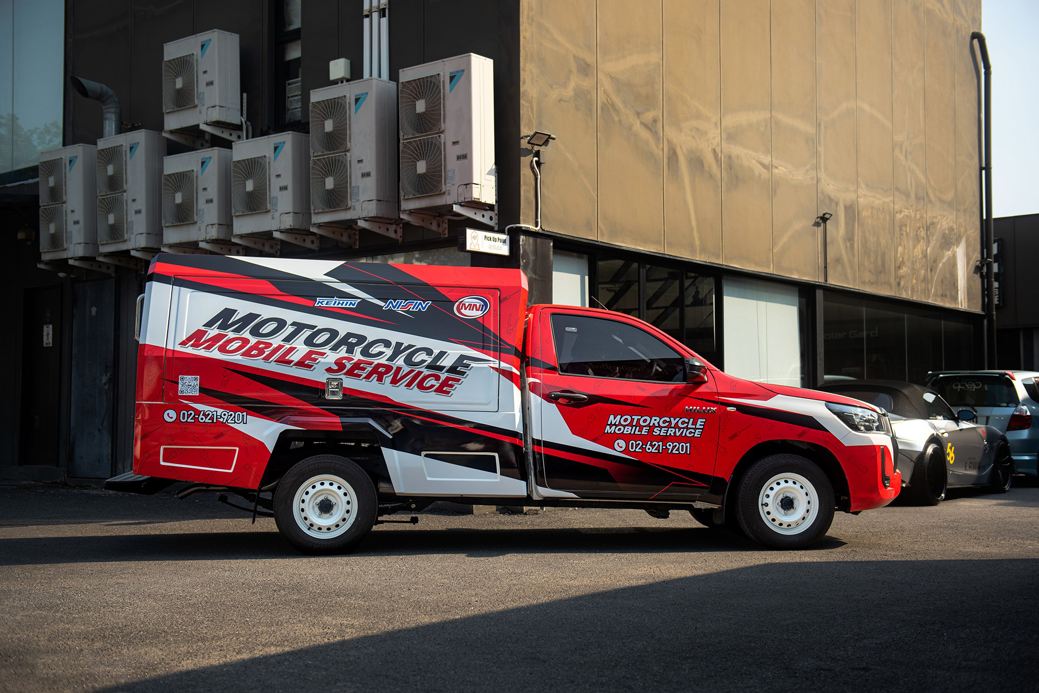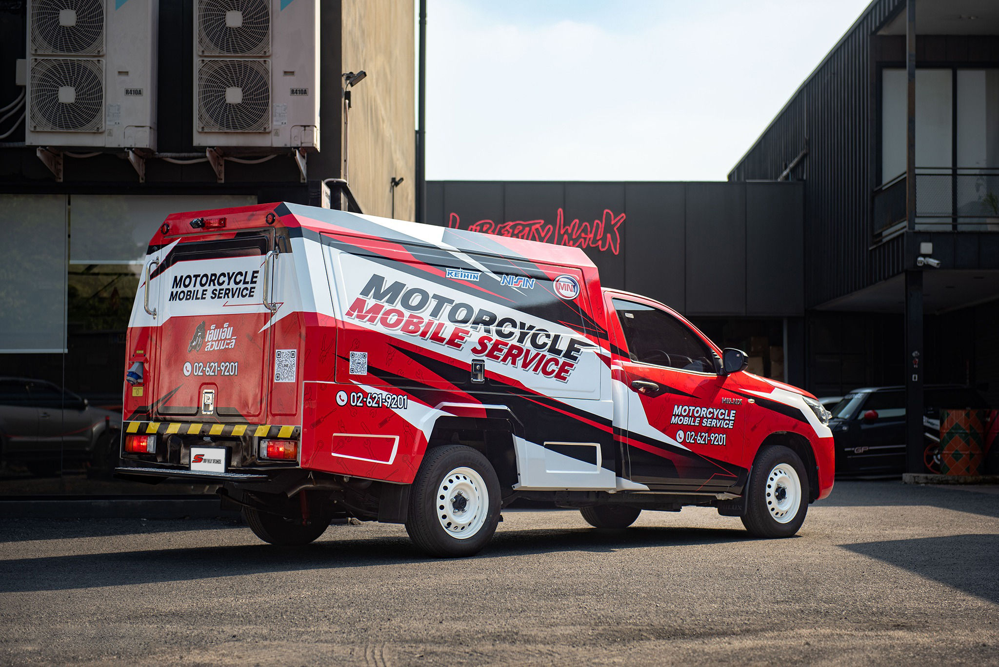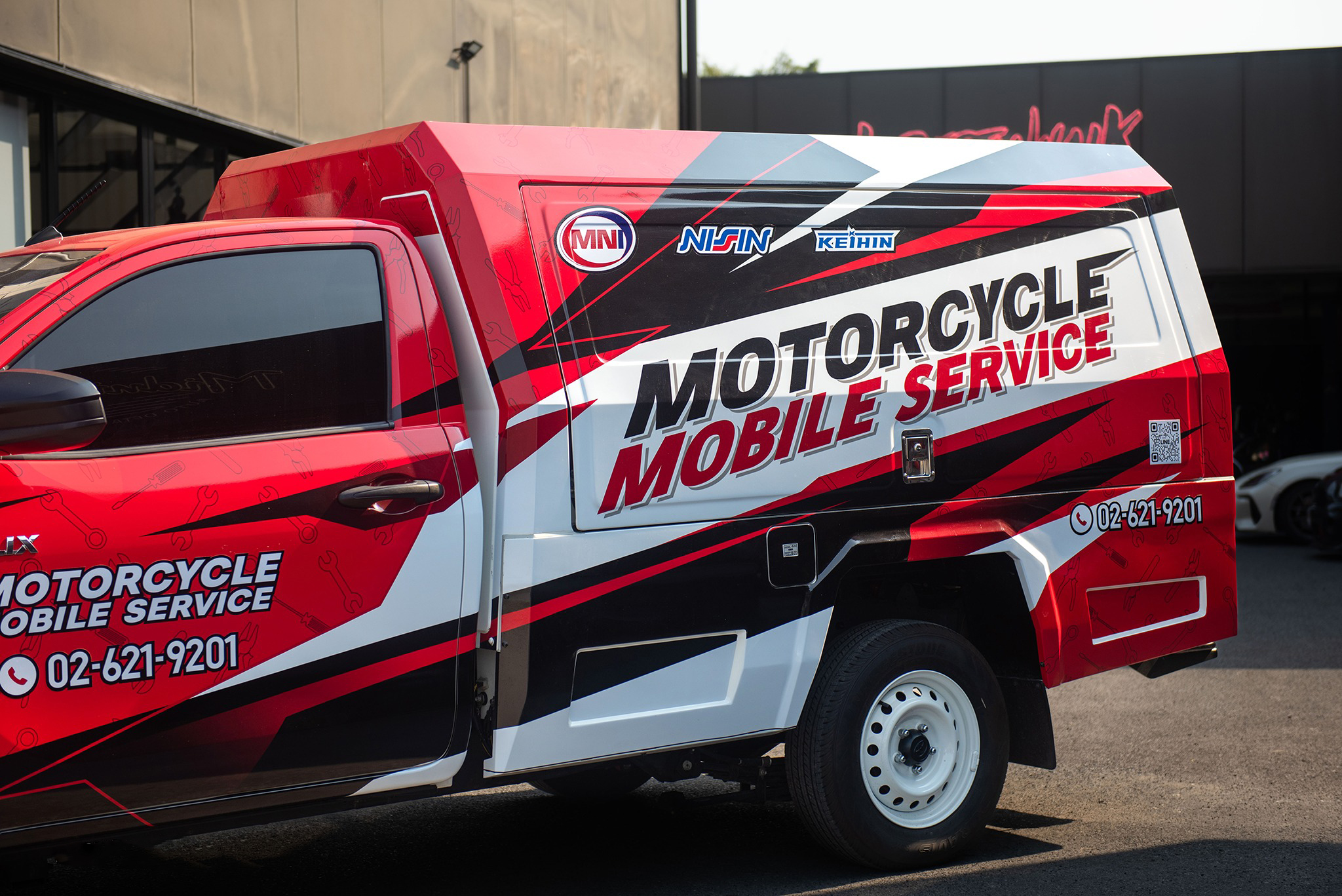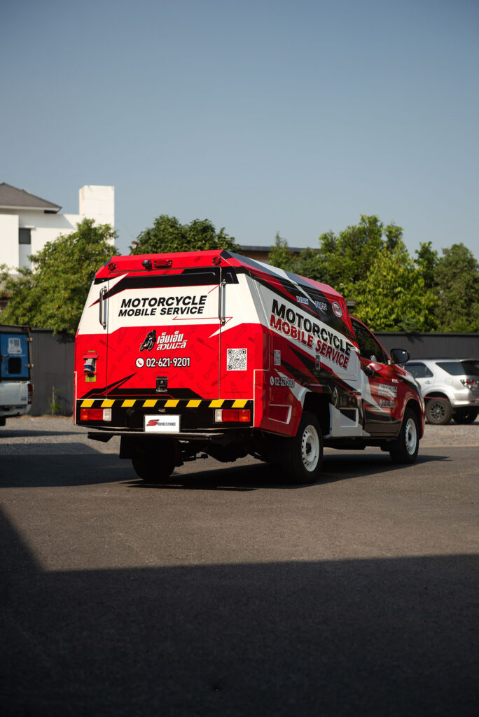 จากรถช่าง…สู่รถแข่งข้างสนาม MN Inter เลือกใช้โทนสีแดงตัดกับสีดำและขาว ลวดลายกราฟิกสไตล์ Racing ให้ความรู้สึกเหมือนรถทีมแข่งในสนาม พร้อมโลโก้ “Motorcycle Mobile Service” ขนาดใหญ่ที่ด้านข้างตู้ ทำให้รถคันนี้โดดเด่นสะดุดตา ไม่ว่าจะจอดเซอร์วิสที่ไหน ลูกค้าต้องหันมองแน่นอน